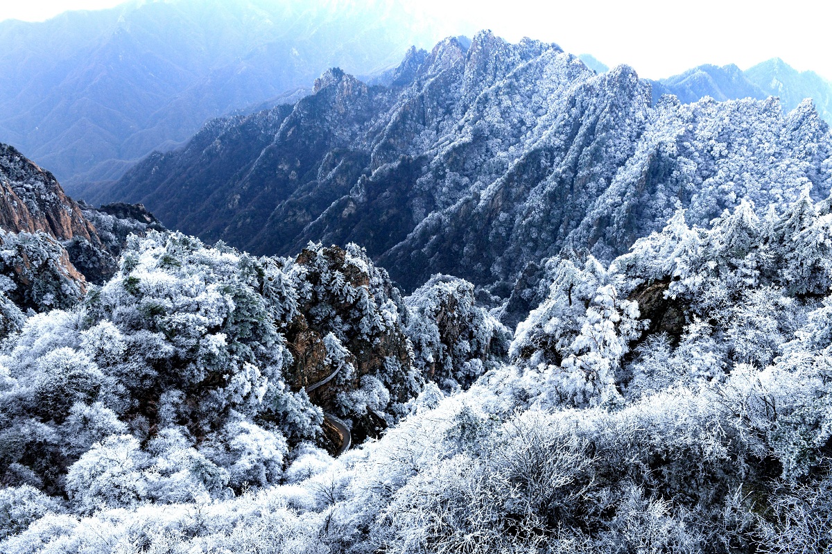 冬日严寒,气温骤降,大山里的树木植被形成了壮美的雾凇景观,游人穿行在山间小道,仿佛置身于冰雪世界。(郑州市惠济区纪委监委 张玉梅 摄)