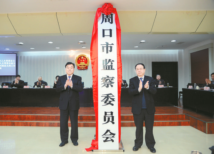 刘继标、刘国连为新成立的周口市监察委员会揭牌,标志着我市深化国家监察体制改革试点工作迈出了关键性一步,标志着肩负全市公职人员监察职责的新部门——周口市监察委员会正式成立。
