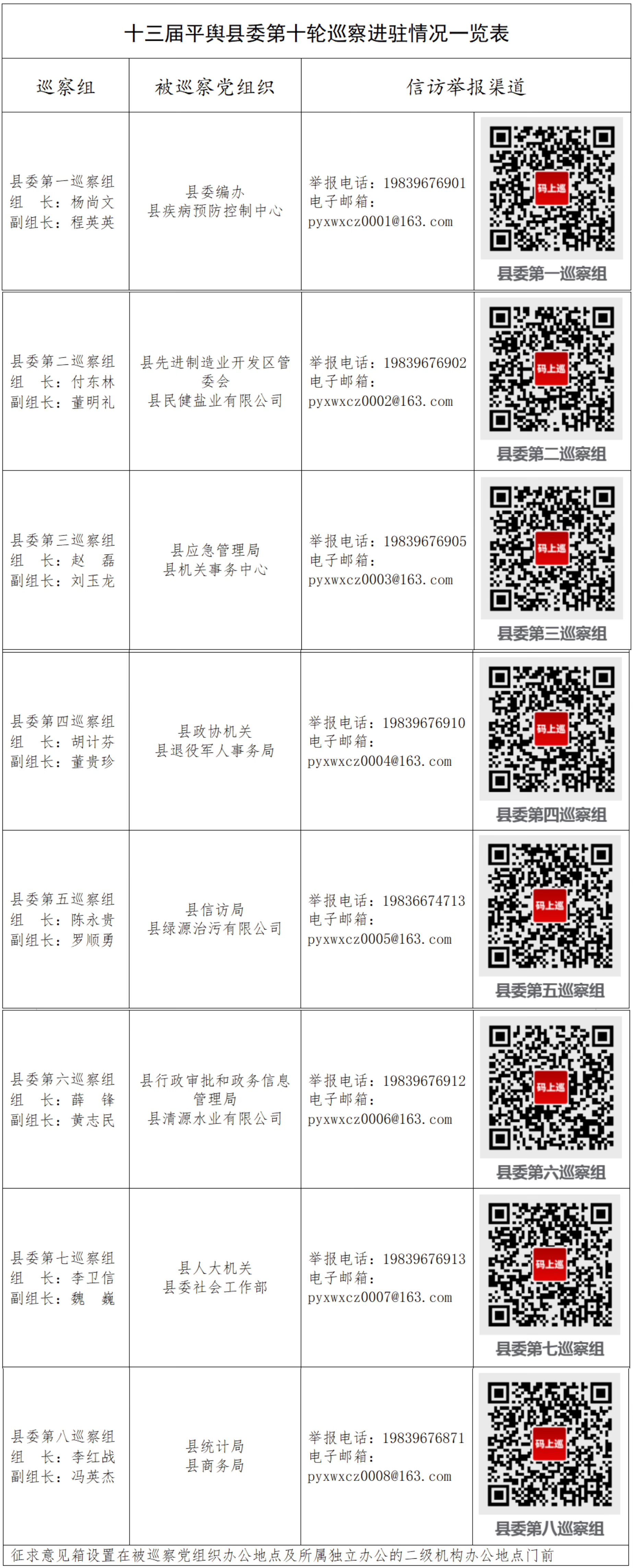 根据县委统一部署,十三届平舆县委第十轮巡察安排8个巡察组,采取“一拖二”的方式,于2025年7月14日至8月22日对县人大机关、政协机关等14个党组织开展常规巡察,对县统计局、商务局2个党组织开展巡察“回头看”。截至目前,巡察组已全部完成进驻。