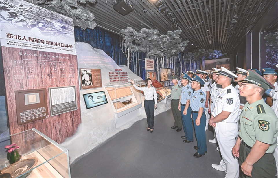7月7日上午,纪念全民族抗战爆发88周年仪式暨《为了民族解放与世界和平》主题展览开幕式在中国人民抗日战争纪念馆举行。图为当日,解放军官兵参观主题展览。新华社记者 陈晔华 摄